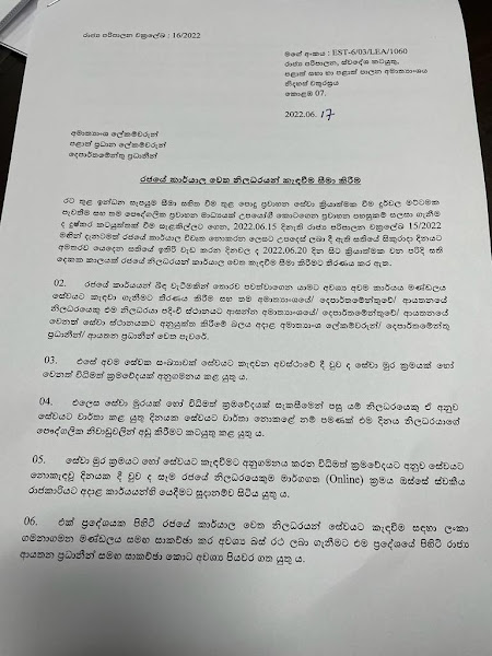 எவ்வாறாயினும், அத்தியாவசிய சேவைகளில் ஈடுபடும் அரச ஊழியர்களுக்கு இது பொருந்தாது என அதில் குறிப்பிடப்பட்டுள்ளது.