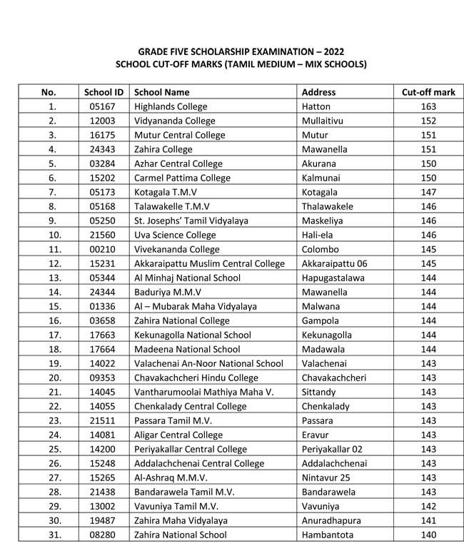 2022 ஆம் ஆண்டு 5 ஆம் தர புலமைப்பரிசில் பரீட்சையின் பெறுபேறுகளின் அடிப்படையில், இந்த ஆண்டுக்கான 6 ஆம் தரத்தில் மாணவர்களை பாடசாலைகளுக்கு சேர்த்துக்கொள்வதற்கான வெட்டுப்புள்ளிகள் தற்போது வெளியிடப்பட்டுள்ளன.