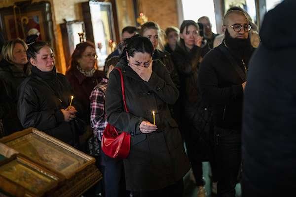 அதே தாக்குதலில் கொல்லப்பட்ட Pysarev Kiriusha (17) எனும் சிறுவனின் இறுதிச்சடங்குக்காகச் செல்லும் உறவினர்களும், துக்கத்தை அடக்க முடியாமல் கண்ணீர் விட்டு கதறிஅழும் காட்சிகளும் வெளியாகியுள்ளன.