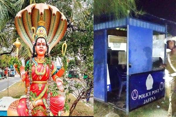 யாழ்.பண்ணை நாக பூசணி அம்மன் சிலைக்கு அருகாமையில் அமைக்கப்பட்ட தற்காலிக பொலிஸ் காவலரண் அடையாளம் தெரியாத நபர்களால் உடைக்கப்பட்டுள்ளது.