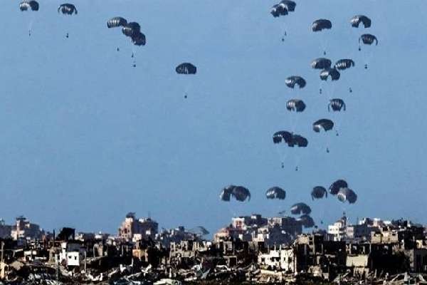 விமானம் மூலமாக காசா பகுதியில் உணவுப் பொதிகள் அடங்கிய பெரிய பார்சல்கள் பாராசூட் கட்டி வீசப்பட்டன.