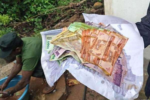 மண்சரிவு காரணமாக முழுமையாக அழிந்துபோன ஒரு வீட்டின் இடிபாடுகளுக்குள் இருந்தே இந்த பொருட்களும் பணமும் கண்டுபிடிக்கப்பட்டன.