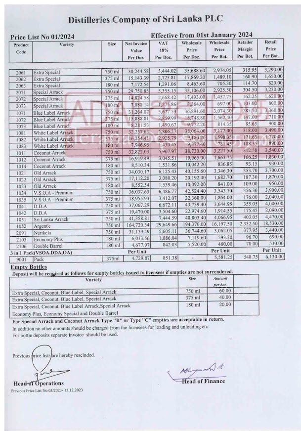 நேற்று முதல் அமுலுக்கு வரும் VAT மற்றும் புதிய கலால் வரியுடன் இலங்கையில் மதுபானத்தின் விலையை அதிகரிக்க நிறுவனங்கள் தீர்மானித்துள்ளன.