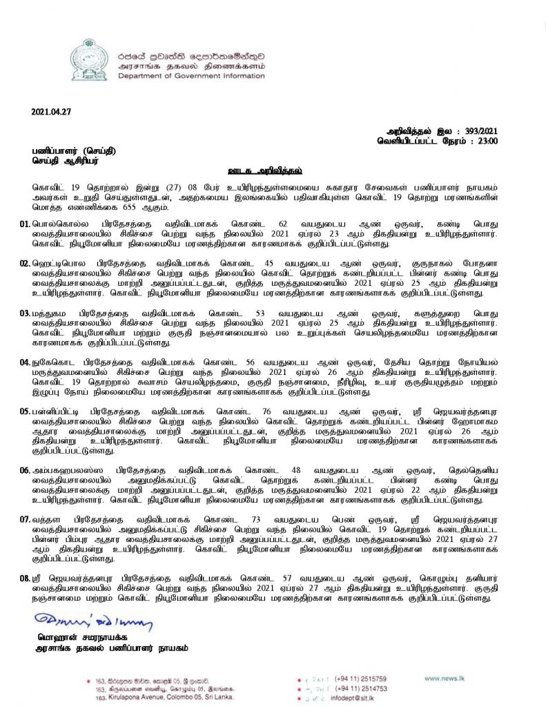 இதன் பிரகாரம், நாட்டில் இதுவரை பதிவாகியுள்ள கொரோனா மரணங்களின் எண்ணிக்கை 655 ஆக அதிகரித்துள்ளதாக சுகாதார சேவைகள் பணிப்பாளர் நாயகம் குறிப்பிட்டுள்ளார்.