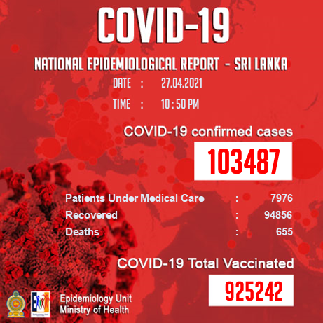 நாட்டில் இதுவரை 103,487 கொரோனா தொற்றாளர்கள் பதிவாகியுள்ள அதேநேரம், 94856 பேர் தொற்றிலிருந்து குணமடைந்துள்ளனர்.