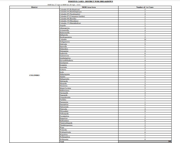 கொள்ளுப்பிட்டி பகுதியில் ஐவர், பம்பலப்பிட்டி பகுதியில் இருவர், பொரளை பகுதியில் இருவர், மருதானை பிரதேசத்தில் ஒருவர், மட்டக்குளி பகுதியில் ஒருவர், வெள்ளவத்தை பகுதியில் 08 பேர் அடங்கலாக கொழும்பு மாவட்டத்தில் 200 தொற்றாளர்கள் பதிவாகியுள்ளனர்.