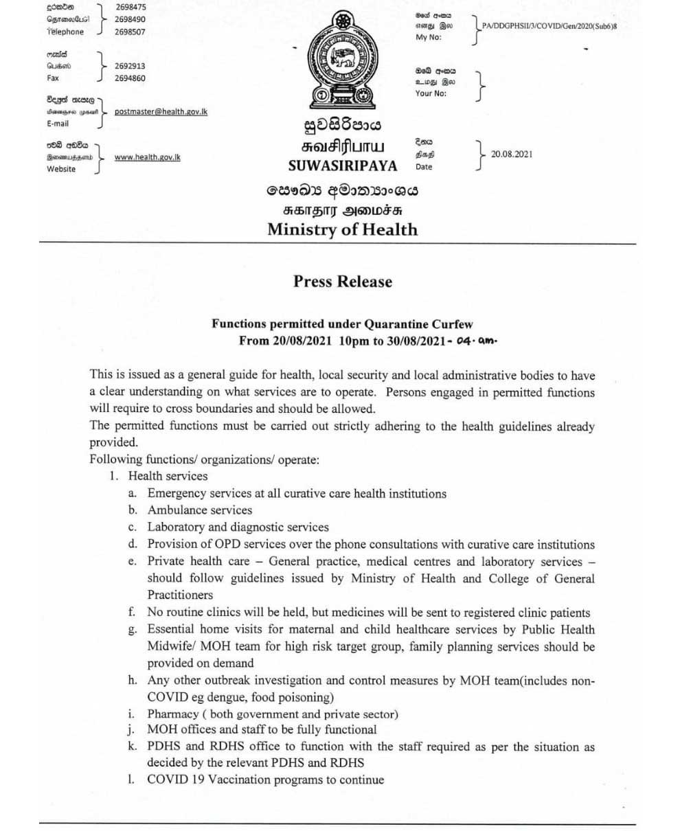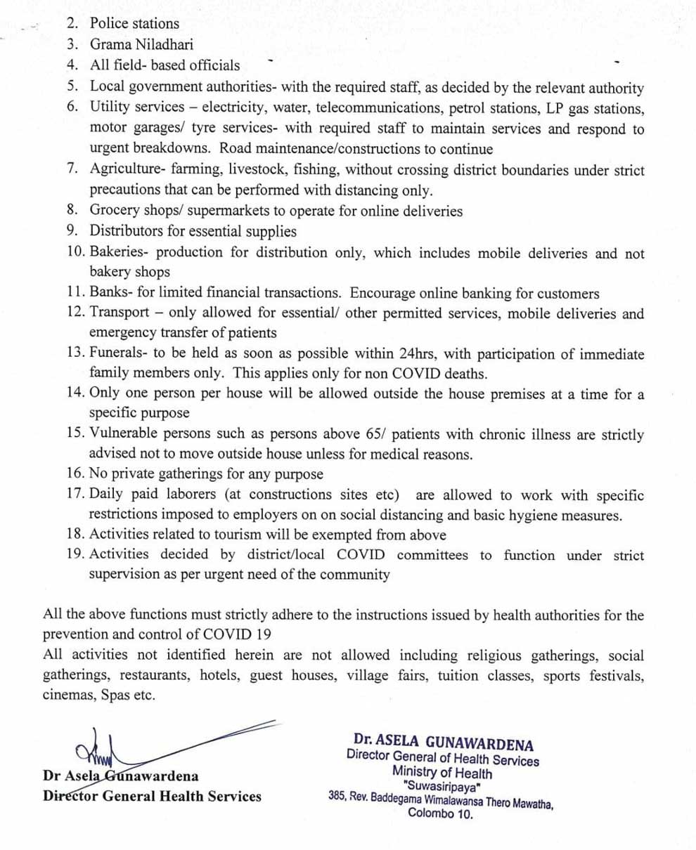 தனிமைப்படுத்தல் ஊரடங்கு பிறப்பிக்கப்பட்டுள்ள காலப்பகுதியில் முன்னெடுக்கக்கூடிய மேலும் 9 சேவைகள் குறித்த அறிக்கை சுகாதார அமைச்சினால் வெளியிடப்பட்டுள்ளது.