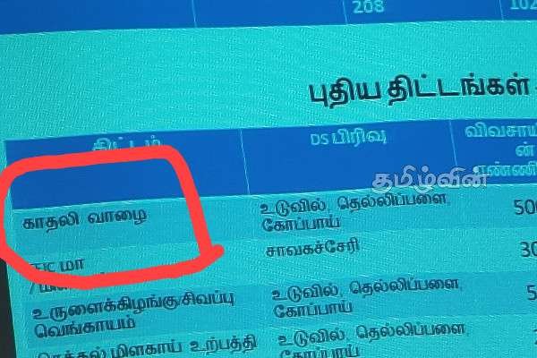 யாழ்ப்பாண மாவட்ட செயலகத்தில் இடம்பெற்ற அபிவிருத்தி கலந்துரையாடலில் "கதலி" வாழைக்கு பதிலாக "காதலி," வாழை என திரையில் தோன்றியுள்ளது.