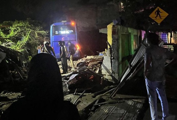 இந்த பேருந்து அதிகாலை 3.30 மணியளவில் 4ம் கட்டை பகுதியில் வேகக்கட்டுப்பாட்டை இழந்த நிலையில் வீதியை விட்டு விலகி அருகிலுள்ள வர்த்தக நிலையங்கள் பலவற்றை உடைத்தெறிந்துள்ளது.