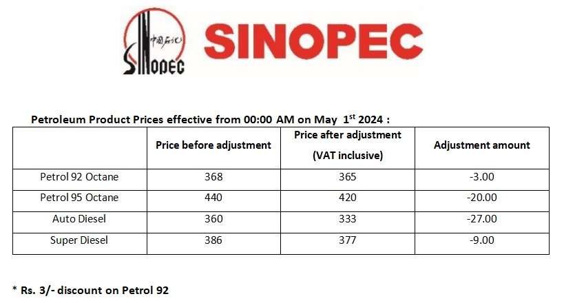 நேற்று நள்ளிரவு முதல் இலங்கை பெற்றோலிய கூட்டுத்தாபனம் மற்றும் லங்கா ஐஓசி நிறுவனங்கள் தமது எரிபொருட்களின் விலைகளில் திருத்தத்தை மேற்கொண்டிருந்த நிலையில் சினோபெக் நிறுவனம் இந்த அறிவிப்பை விடுத்துள்ளது.