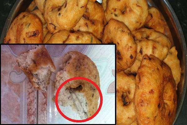 குறித்த வடையை வீட்டில் சென்று சாப்பிட்ட போது அவ் வடைக்குள் பெரிய சட்டை ஊசி ஒன்று காணபட்டுள்ளது.