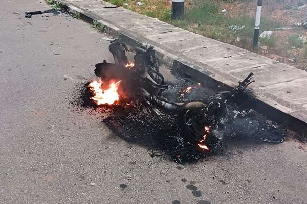 சகோதரர்கள் சண்டையால் எரிந்து கருகிய மோட்டார் சைக்கிள்