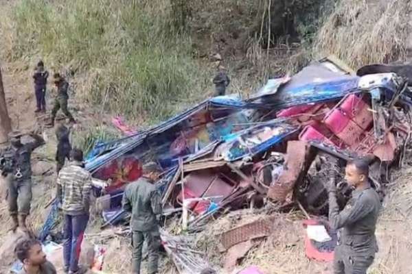 விபத்தில் சிக்கிய பேருந்து, சாலையை விட்டு விலகி பாதுகாப்பு வேலிக்கு மேலே வைக்கப்பட்டிருந்த தண்டவாளத்தில் மோதியதால் சரிந்து பேருந்து பாறையில் பயணிக்க ஒரு சாய்ந்த விமானம் போல கீழே விழுந்துள்ளது என தெரிவிக்கப்பட்டுள்ளது.