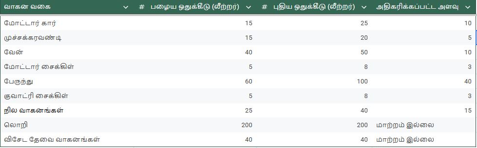 இதன்படி, வாகனங்களுக்கான புதிய எரிபொருள் ஒதுக்கீட்டு விபரங்கள் பின்வருமாறு: